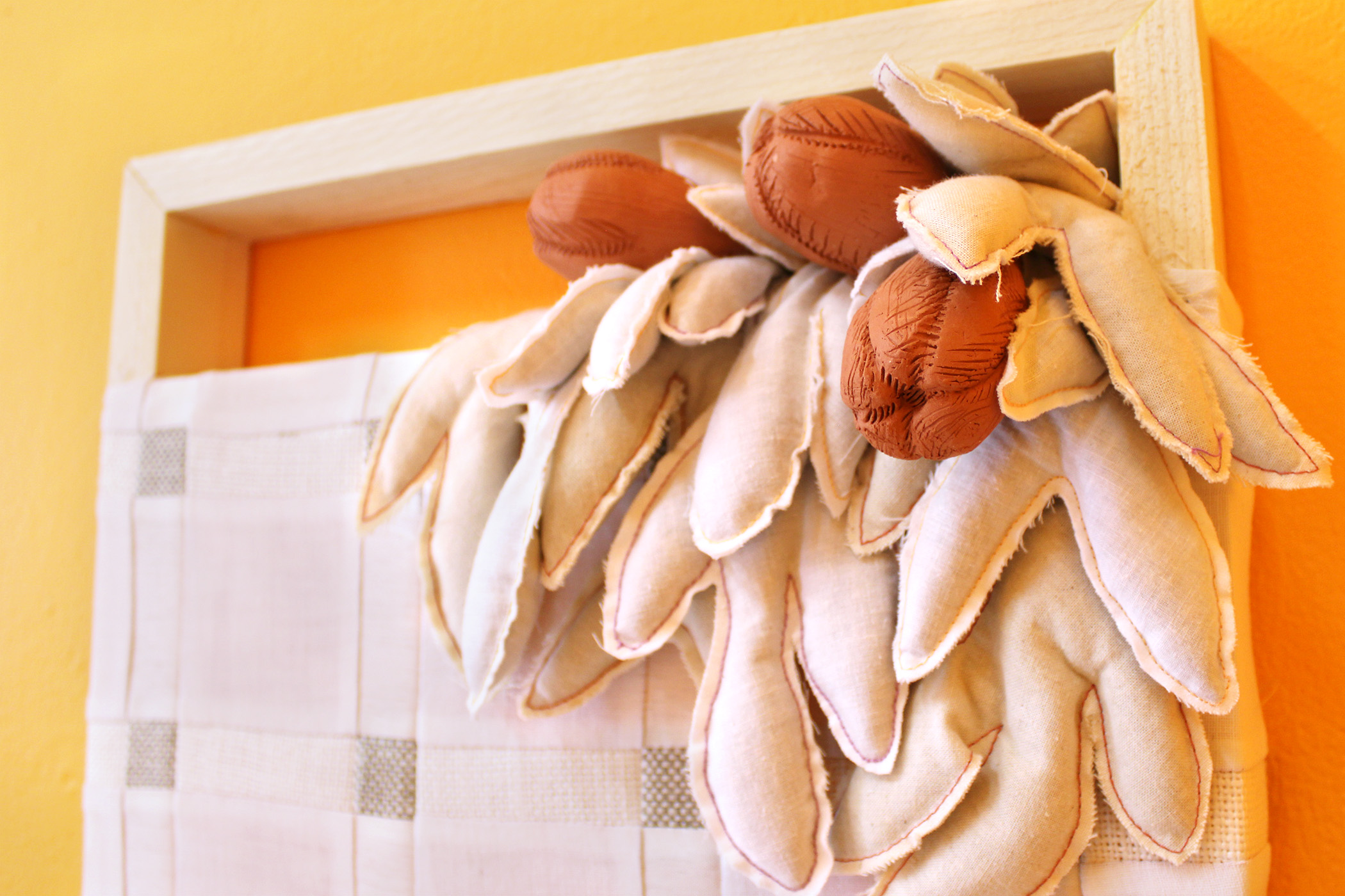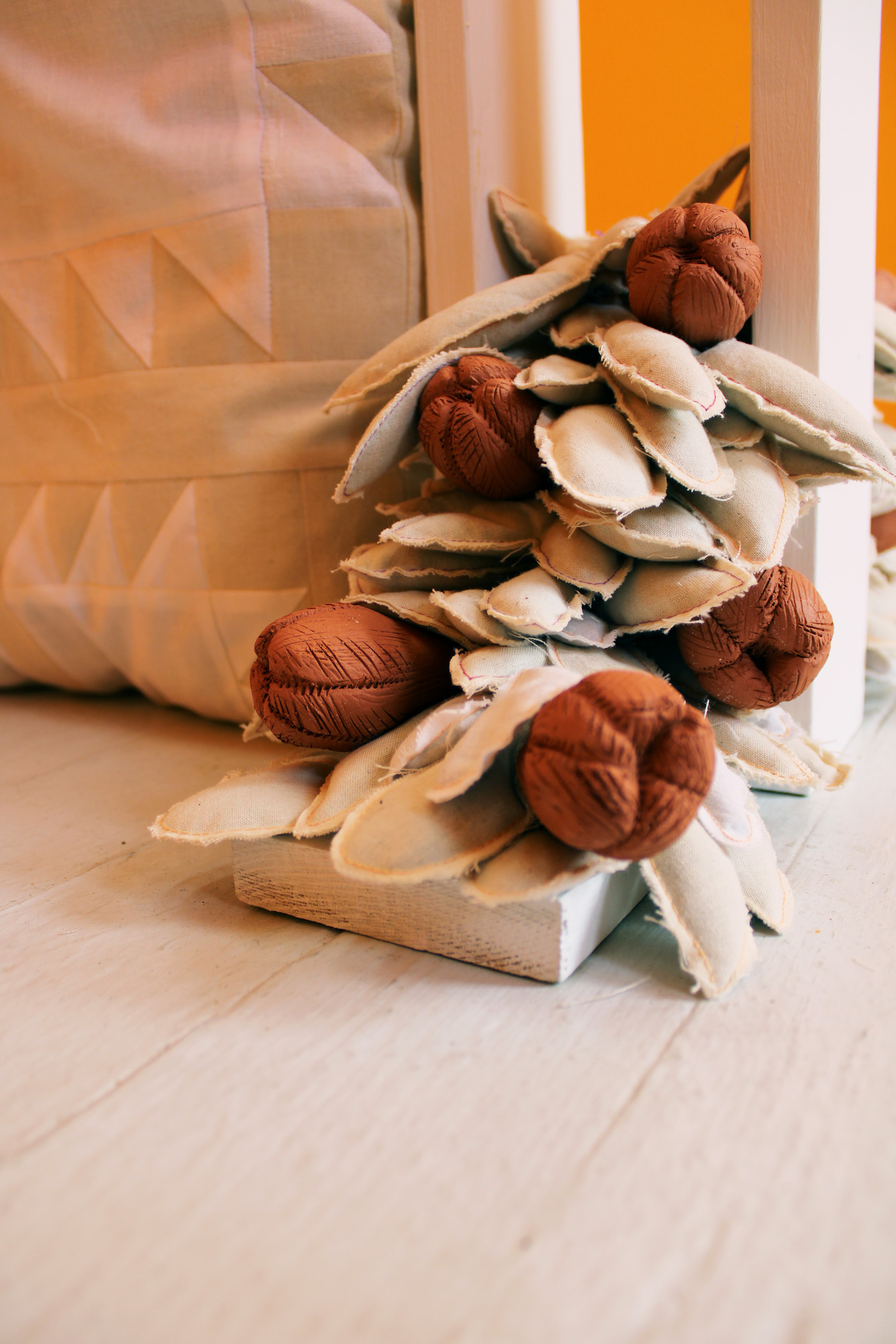 Embedded Relationships, a solo exhibition by Britny Wainwright, continues the artist’s interest in combining soft fiber with hard ceramics. The orange-drenched gallery complements the desaturated palette of creams, whites, and earthy terra-cotta browns. Textural floral motifs partner with traditional quilt block patterns to speak about the intimate domestic space. Flower buds, or perhaps flowers past their prime, are included in all works. Sometimes they are flat abstracted renderings, other times as bulb-shaped unglazed ceramic components stacked and bunched with muslin leaves stuffed with sand. This exhibition ponders the quiet and makes us stand still.
